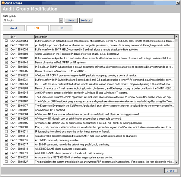 Within the product the customer selects the Audit tab and then the Audits sub-tab (or Menu->Tools->Audit Groups). And then select the CVE sub-tab. The customer will see this screen with all available CVE names and their descriptions: