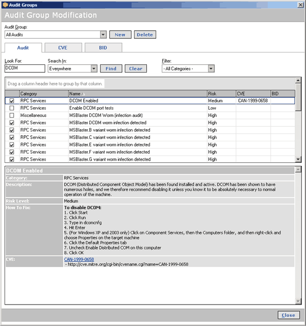 Alternatively, the customer could follow the steps in 17 and enter the problem, such as DCOM and would be presented with a list of audits, each one containing the CVE name and link in addition to the other required information. As below: