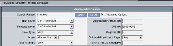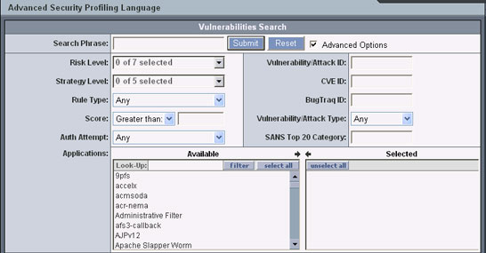 - Under Analyze: ASPL > Vulnerabilities, select one or more of the following criteria. Check Advanced Search to access these criteria. Select zero or more items from each criterion list.