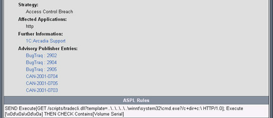Details about the vulnerability or attack condition, including the component ASPL rules and related attack and vulnerability conditions, are displayed. A vulnerability's CAN or CVE ID is displayed under "Advisory Publisher Entries."