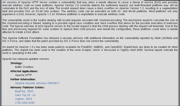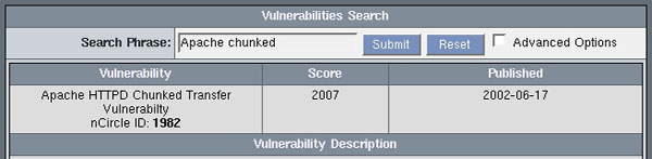 Additionally, if a user chooses to search for vulnerabilities by name, the CVE or CAN associated with the results is displayed within the details for each condition. This display also provides a link the cve.mitre.org and the content associated with this CVE or CAN.