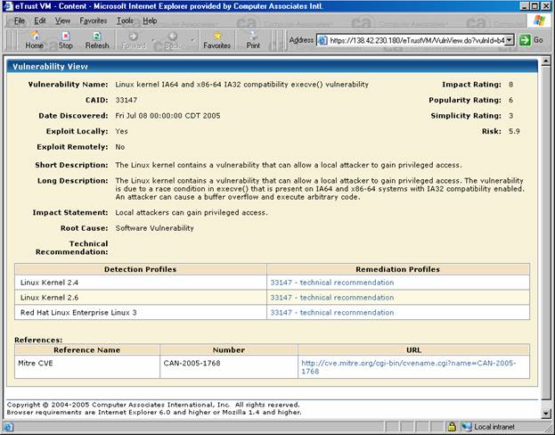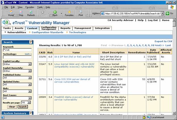 CVE-compatible database, like eTrust Vulnerability Manager.