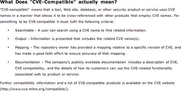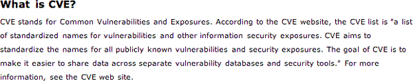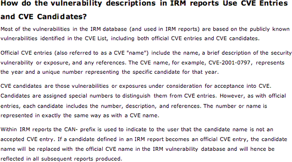 This is provided in reports in the form of CVE references and a general description of CVE (a current draft of the CVE documentation is shown below).