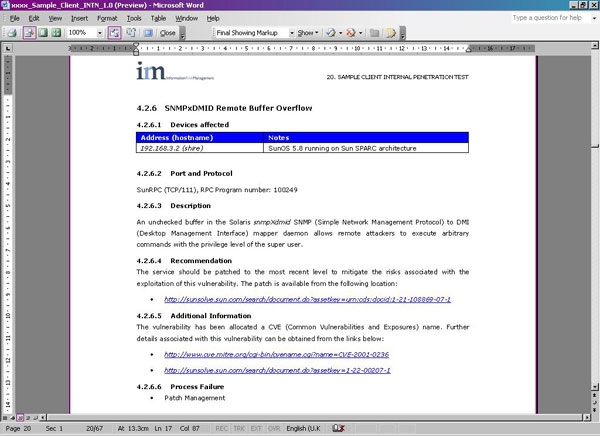 Every vulnerability identified during the test is displayed on a separate page of the report, which includes details of the vulnerability in addition to the CVE reference and other vendor links to patches and further information (see screenshot below).