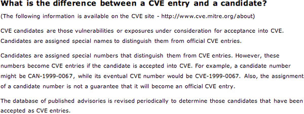 If CVE candidates are supported or used, explain where and how the difference between candidates and entries is explained to your customers (recommended) :