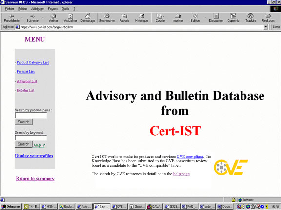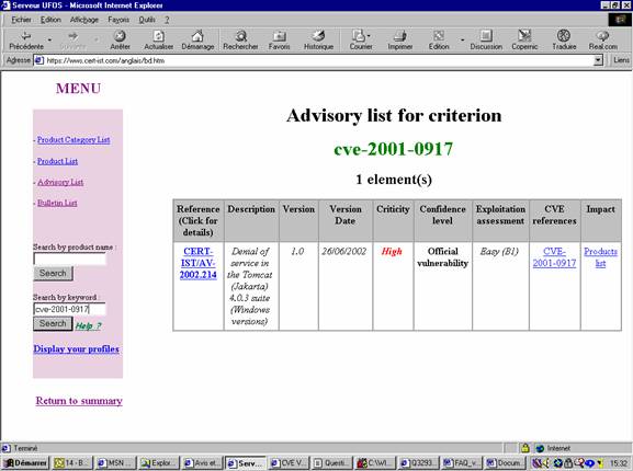 There is also an online mapping on our public Web site ( http://www.cert-ist.com ) that links each advisory of the database to its associated CVE name.