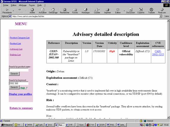 Our vulnerability database is accessible to our customers through a private web site (restricted access through certificates). It is also possible for the public to view the list of Cert-IST latest advisories on our public web site.