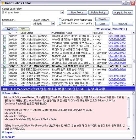 The user can use the search feature of the Scan Policy Editor to search for the specific CVE names or press the View All button to view all supported CVE names. Then by clicking on the CVE name in interest, the user can view the detailed description of the vulnerability, the impact the vulnerability could have on the system, various methods that can be used to fix the vulnerability, links to available patches, vender, and other reference sites. Also, the resulting scan policy can be saved to perform a scan of the network using the selected policy.