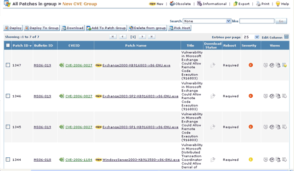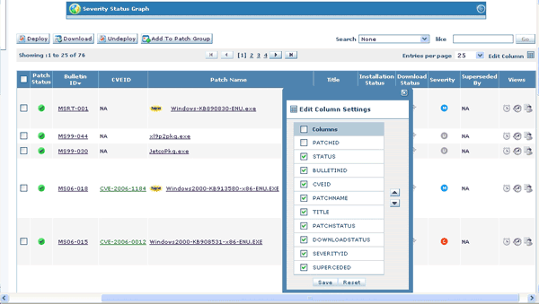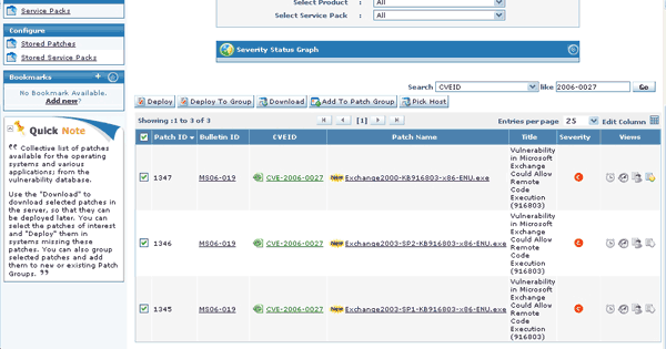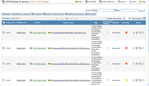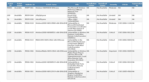 The patch information view gives a complete listing of the security elements and the associated CVE names as shown in the screen shot below.