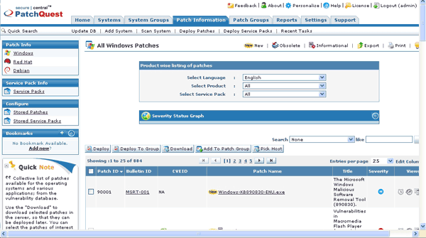 SecureCentral PatchQuest is available as a downloadable .exe (for Windows) and .bin (for Linux) from the website http://patchquest.com . There is a free edition for the product and customers can buy the product license directly from AdventNet or through resellers.