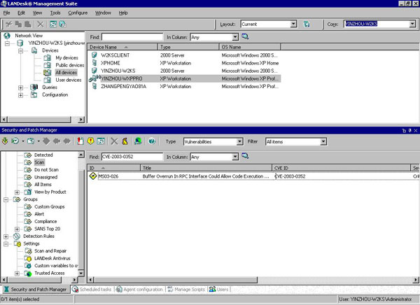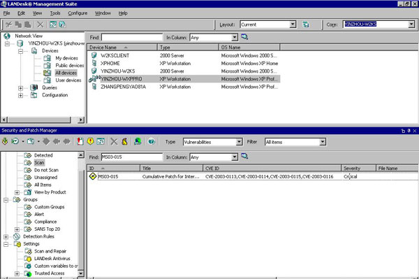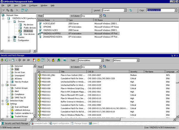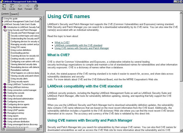 LANDesk's Security and Patch Manager tool supports the CVE (Common Vulnerabilities and Exposures) naming standard. With Security and Patch Manager you can search for a downloaded vulnerability by its CVE name. You can also view the CVE name(s) associated with an individual vulnerability.