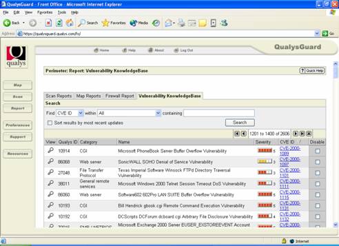 The QualysGuard Vulnerability KnowledgeBase is updated on a daily basis with graduation information from CAN to CVE which is immediately available via the QualsyGuard Web based Userinterface.