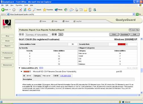 As the following screenshot demonstrates, vulnerabilities listed in the QualysGuard Vulnerability KnowledgeBase have CVE names listed and a link to the associated page on the cve.mitre.org website.