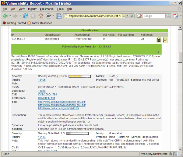 Catbird V-Security displays reports through the web based portal. Reports can be saved in Adobe PDF format. By utilizing the search features in the browser or Adobe Reader, the reports can be searched for CVE-related text.