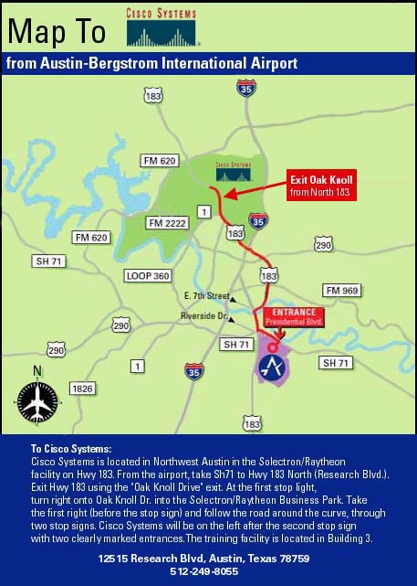 Directions to Cisco:(From Airport) At the exit to the airport, exit, turn